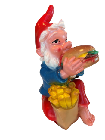 Een leuke tuinkabouter die geniet van zijn hamburger en frietjes. De tuinkabouter is gemaakt van het beste, slagvaste en vorstbestendige type kunststof dat er is. Dit kabouterbeeld is weerbestendig en kan tegen regen en vorst.