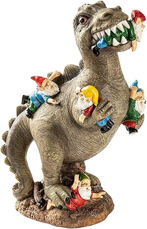 Dinosaurus T-rex eet tuinkabouters