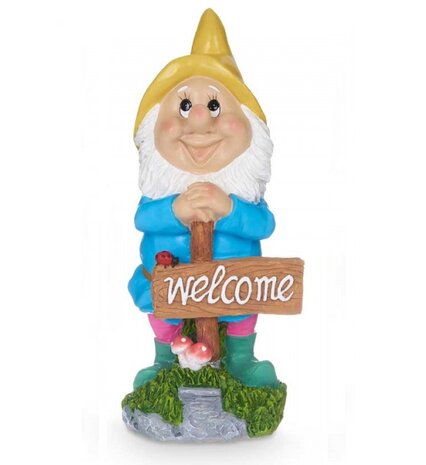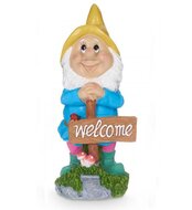 Mooie, kleurrijke polyresin tuinkabouter met blauwe jas, een schep en Engels Welkom bordje. Een leuke kabouter voor naast je deur.